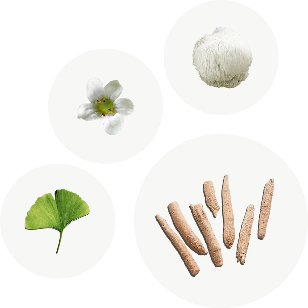 L-Tirosina, estratto secco di pianta intera di Bacopa (Bacopa monnieri (L.) Wettst) con il 40% di bacosidi, L-Teanina, Capsula vegetale (agente di rivestimento: idrossipropilmetilcellulosa), Caffeina anidra, estratto secco di foglie di Ginkgo (Ginkgo Biloba L.) con il 24% di glicosidi flavonoidi, estratto secco di sporoforo di Criniera di Leone (Hericium erinaceus (Bull.) Pers.) con il 20% di polisaccaridi, estratto secco di parti aeree di Huperzia serrata (Thunb.) Rothm. con lo 0,2% di huperzina, agente di carica (cellulosa microcristallina).